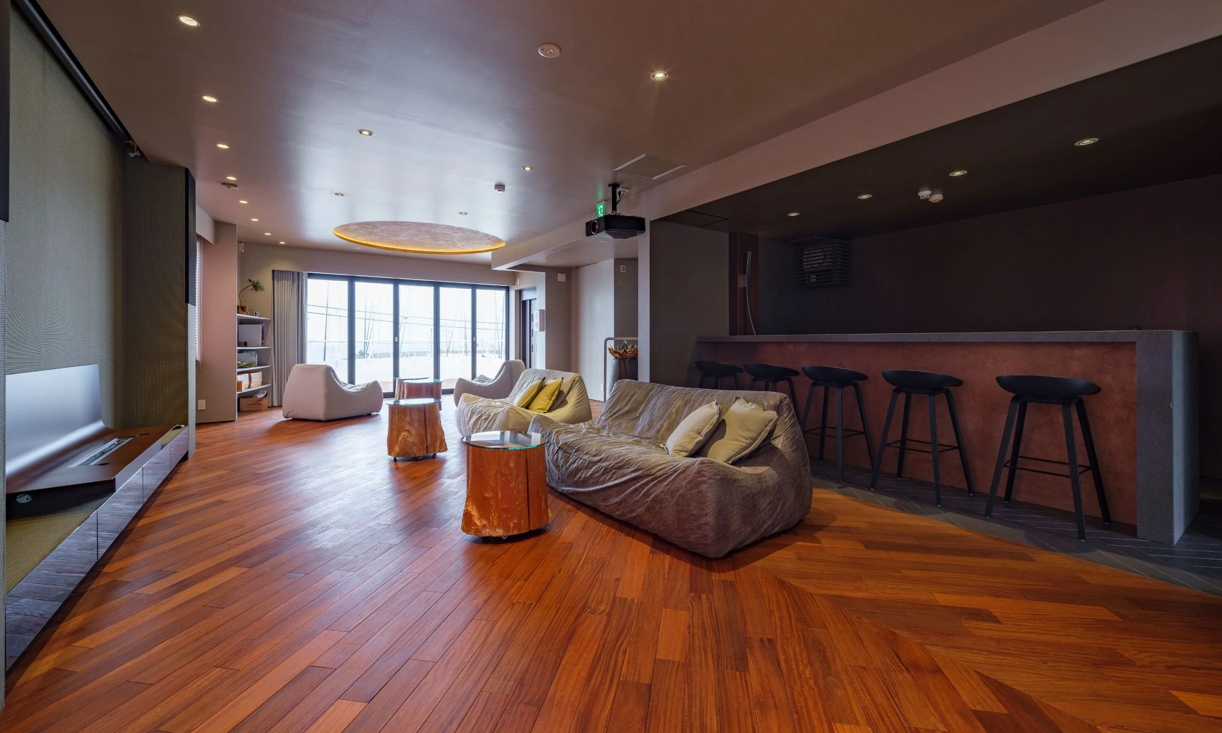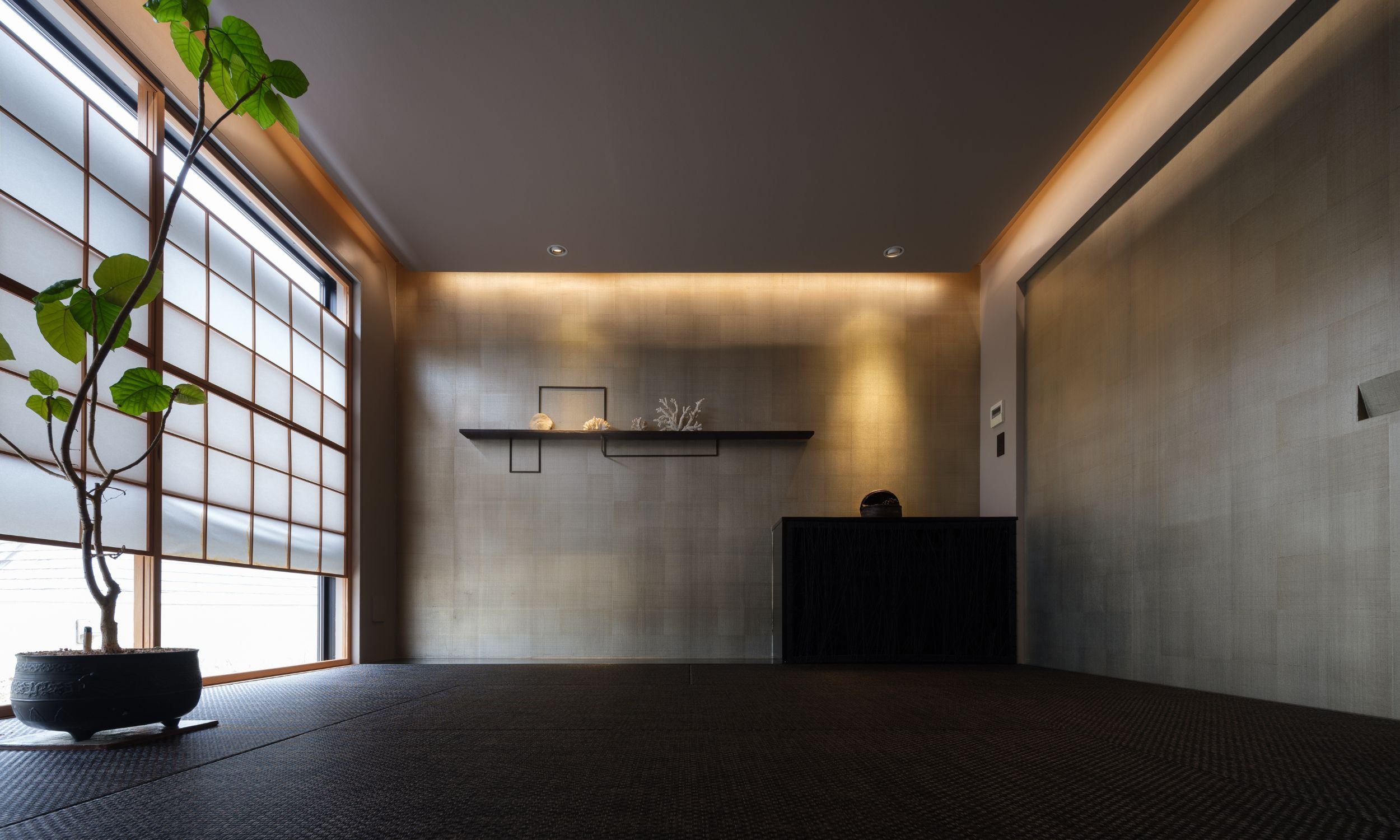 ラウンジに隣接するのは、現代的な設えの和室です。洗練された素材感の畳が広がるこの空間は、足を伸ばしてリラックスできるリトリート・スペース。お子様連れのご家族や、賑やかな語らいの合間にひと休みしたいゲストに最適です。