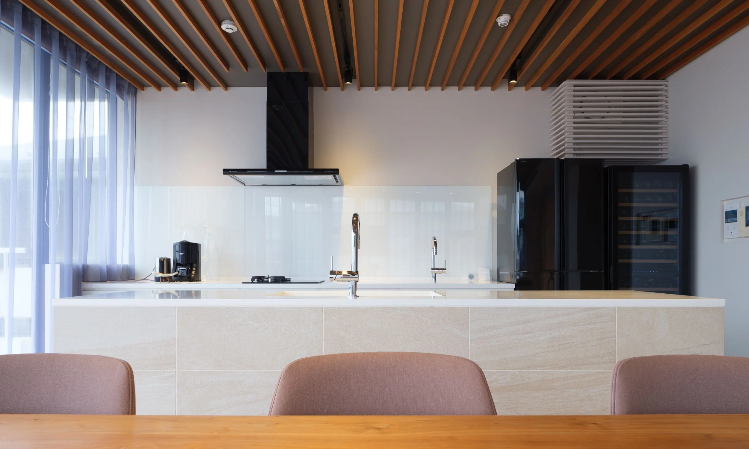 2階フロアの海側に位置するのは、マリーナの情景と溶け合うアイランドキッチン。 ここは、プロフェッショナルのための仕事場ではなく、ゲスト全員が軽やかに、そして直感的に振る舞える「社交の場」としてデザインされました。